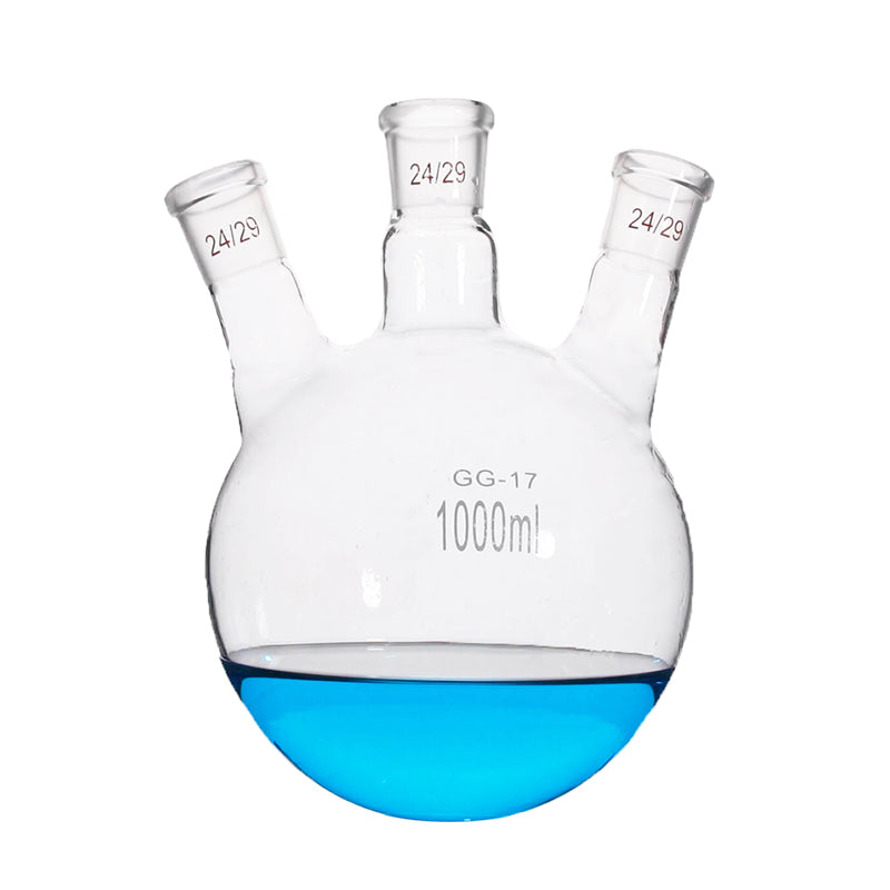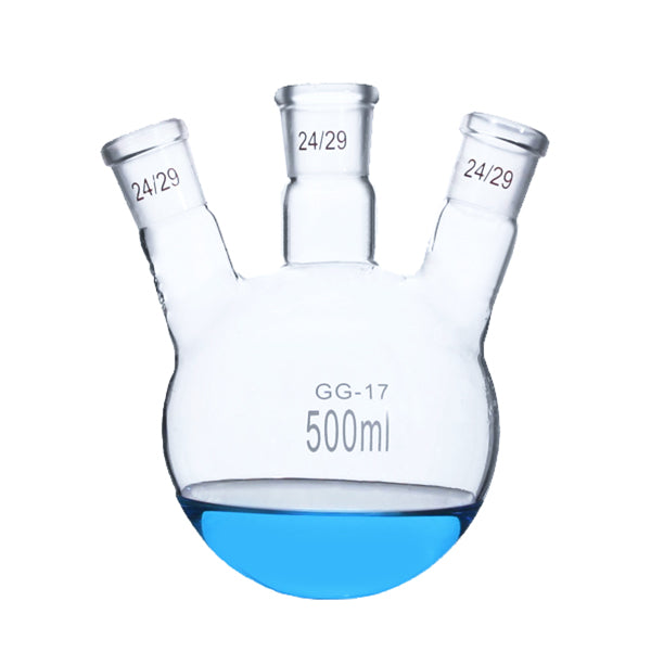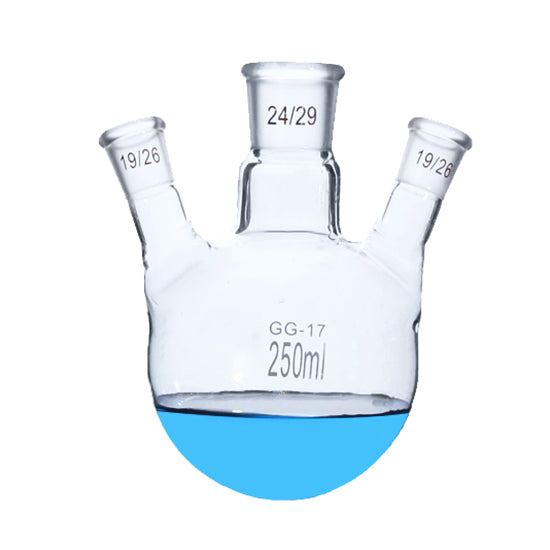 An angled three-neck flask is a specialized piece of laboratory glassware designed for complex chemical reactions and processes that require multiple simultaneous operations. The flask features three necks arranged at specific angles, providing versatility and flexibility in experimental setups.